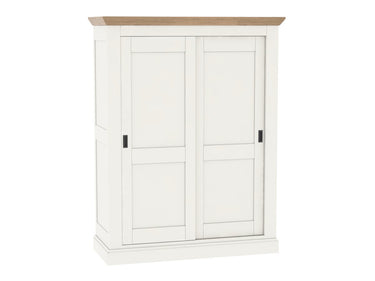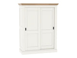 Meuble en chêne massif, certifié Origine France Garantie. Profondeur utile : 50 cm. 1/2 penderie à gauche : 1 tablette fixe et une barre de penderie. 1/2 lingère à droite : 4 tablettes dont 1 fixe. Option bloc 2 tiroirs en partie basse. Composition : - Meuble sur socle hauteur 13 cm. - Corniche, avant, côtés, séparation, socle : chêne massif. - Portes : coulissantes, en chêne massif avec panneaux placage chêne. Poignées métal brun foncé (RAL 8019). - Derrière & plancher : chêne massif ou abouté 20mm. - Tablettes : chêne massif en teinte 26. Réglables en hauteur sur taquets métalliques.