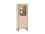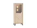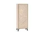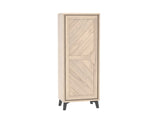 Meuble en chêne massif, certifié Origine France Garantie. 3 tablettes bois. Composition : - Assemblage de la structure à "queues droites". - Dessus, côtés, plancher : chêne massif. - Portes : sur charnières invisibles avec amortisseur. Cadre des portes en chêne massif, panneaux centraux en médium plaqué chêne à 45°, avec grain d'orge. - Derrière : chêne massif ou abouté 20mm. - Pieds : multiplis bouleau toujours laqués noir mat. - Tablettes : chêne massif ou abouté laqué noir. Réglables en hauteur sur taquets métalliques.
