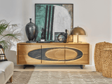 Meuble en chêne massif, certifié Origine France Garantie. 1 cloison entre les 2 portes de droite, 1 tablette de chaque côté. Dimensions utiles H 43 P 35. Composition : - Dessus, côtés, plancher, séparation : chêne massif. - Portes : sur charnières invisibles avec amortisseur. Support en médium 13mm toujours laqué noir mat, panneaux décors en chêne massif vissés depuis l'arrière des panneaux support. Décors en céramique marbrée maintenus en feuillure dans les décors chêne. - Derrière : chêne massif ou abouté 20mm. - Pieds : chêne massif toujours laqués noir mat. - Tablettes : chêne massif ou abouté laqué noir. Réglables en hauteur sur taquets métalliques.